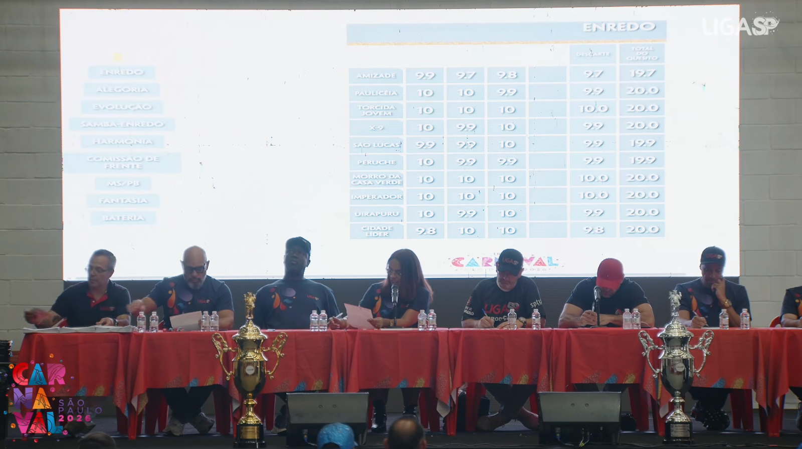 A leitura das notas aconteceu na tarde deste domingo (8), na Fábrica do Samba, sede administrativa da Liga-SP. Após a abertura de todos os envelopes e somatória dos quesitos julgados, foram conhecidas as duas escolas que desfilarão em 2027 no Grupo de Acesso I do Anhembi.